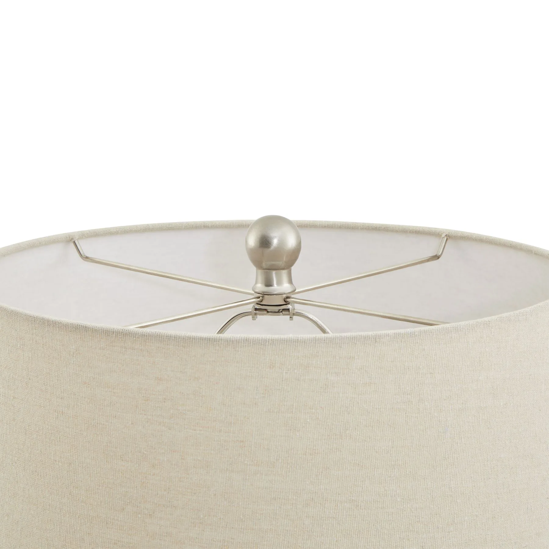 Dimensions: 26” H x 15” W. Shade: 100% premium linen. Base: Hand-glazed ceramic in neutral cream. Socket: E26, compatible with LED and incandescent bulbs.